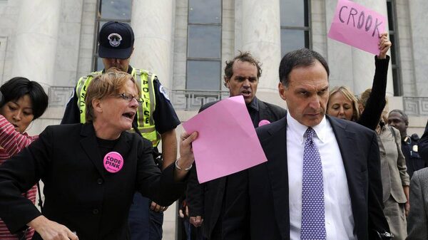 In this Oct. 6, 2008 file photo, Lehman Brothers CEO Richard Fuld is heckled by protesters as he leaves Capitol Hill in Washington after testifying before the House Oversight and Government Reform Committee on the collapse of Lehman Brothers.Susan Walsh/The Associated Press