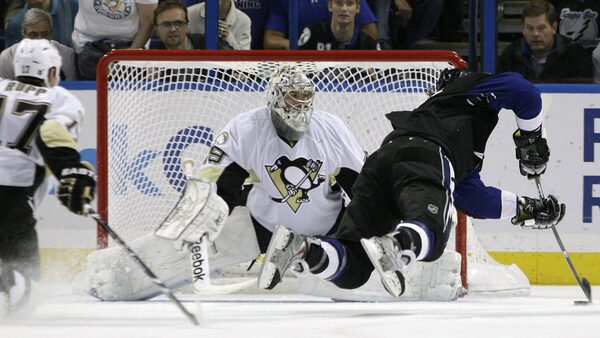 Tampa Bay Lightning left wing Ryan Malone, right, flies through the air after getting tripped by Pittsburgh Penguins left wing Mike Rupp (17) in front of Penguins goaltender Marc-Andre Fleury (29) during the third period of an NHL hockey game Thursday, March 31, 2011 in Tampa, Fla. Rupp drew a two-minute penalty for tripping.Chris O'Meara/The Associated Press