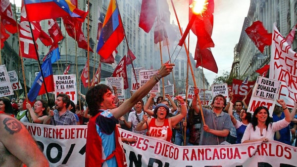 Demonstrators March on Dec. 20, 2002, in Buenos Aires in commemoration of the first anniversary of protests that toppled Argentina's elected president Fernando de la Rua. Mr. De la Rua quit on Dec. 20, 2001 as Argentina's president after two days of violent protests against IMF-approved policies and government corruption that had led to four years of recession and an economic collapse.ALI BURAFI