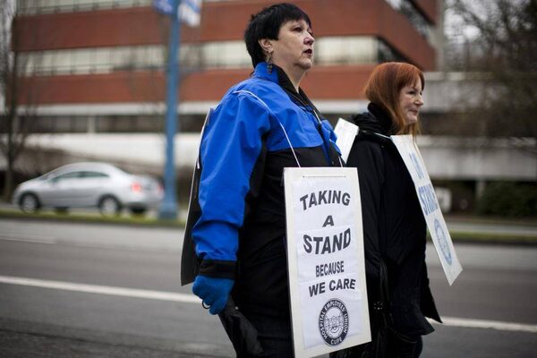 Louella Vincent, left, and Sue Munn of the Hospital Employees’ Union walk in solidarity with other community living workers from various unions outside the Richmond Caring Place in Richmond, B.C.Rafal Gerszak/The Globe and Mail