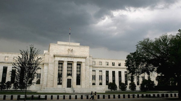Storm clouds gather over the U.S. Federal Reserve Building before an evening thunderstorm in Washington in this June 9, 2006 file photo.Reuters