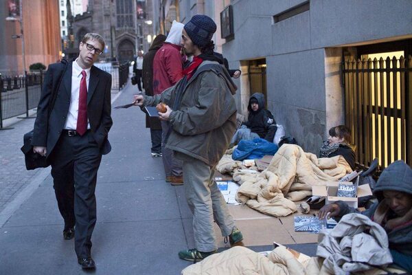 Occupy Wall Street protester Yoni Miller, right, hands out flyers to people at the corner of Wall Street and Nassau Street, across the street from the New York Stock Exchange.ANDREW BURTON/Reuters