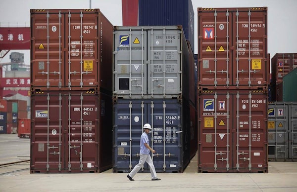 An employee walks past shipping containers at a port near Yangtze River in Wuhan, Hubei province.DARLEY SHEN/Reuters