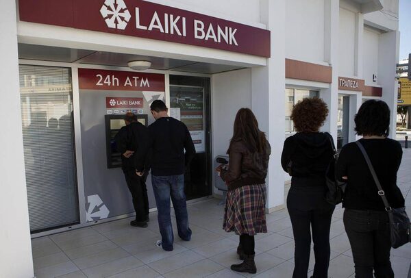People queue to use an ATM machine outside of a Laiki Bank branch in Larnaca, Cyprus on March 16, 2013.Petros Karadjias/The Associated Press