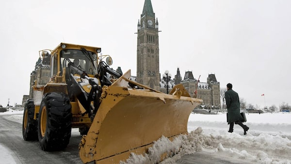 A snow plow clears slush around Parliament Hill amid heavy rain in Ottawa on March 10, 2011.Sean Kilpatrick/The Canadian Press