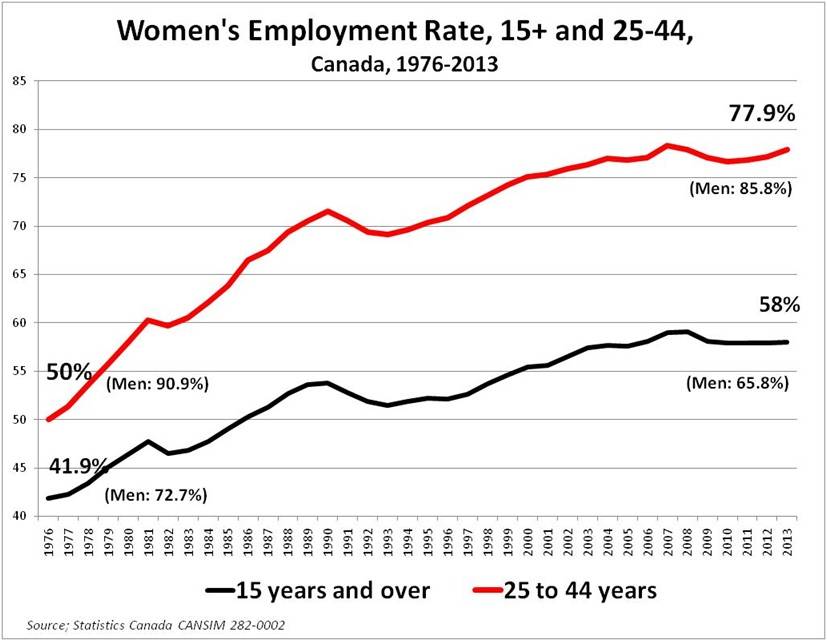 The "work harder" nostrum has been taken seriously by Canadian women, who have warded off deeper inequality for the past 35 years. But it's a time-limited option, not available for the next generation. Female employment rates increased by 40 per cent over the past 35 years. Among women of child-bearing years (25 to 44 years old) it went up a whopping 56 per cent.