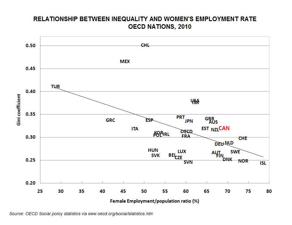Look around the world and you'll see a tight relationship between the level of income inequality in a nation and the proportion of women who work in the paid labour force, as the OECD chart unequivocally shows. (For more, see here.)