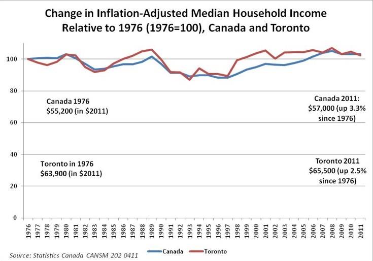 The trouble is, we're pedalling faster to stay in the same place, and our strategies are running out of time. Median household incomes have barely held the line in the last 35 years -- which is, sadly, a better trajectory than in the U.S. But "household incomes" now usually means two workers, not one; and this generation of workers is far more educated, as a cohort, than households in the 1970s.