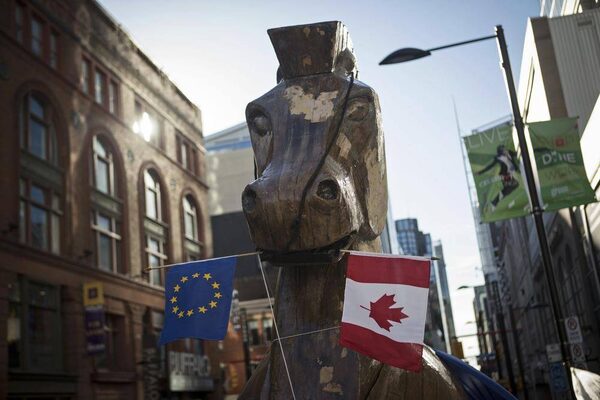 A giant Trojan horse statue holding EU and Canadian flags in its mouth, set up by the social activist group ‘Council of Canadians’ in front of the Ontario Investment and Trade Centre in Toronto to protest the Comprehensive Economic and Trade Agreement (CETA) between Canada and the European Union.MARK BLINCH/Reuters