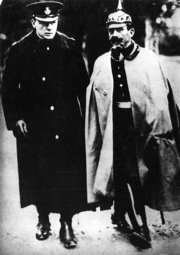 Winston Churchill, president of the Board of Trade, and Kaiser Wilhelm II of Germany at the German Army manoeuvres, 1909.