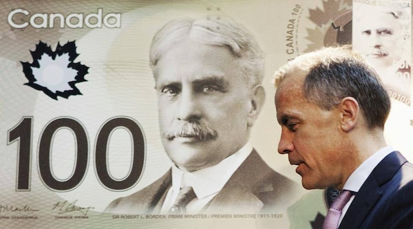 Mark Carney, governor of the Bank of Canada and chairman of the Financial Stability Board, walks past a replication of the new Canadian 100 dollar bill made of polymer in Toronto November 14, 2011.Mark Blinch/Reuters