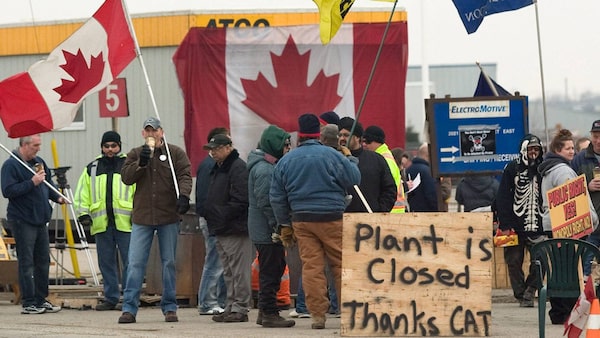 CAW workers picket outside at the Electro-Motive plant in London, Ont., on Feb. 3, 2012, the same day that U.S.-based heavy equipment maker Caterpillar Inc. announced it was closing the plant and moving its production to Indiana.The Canadian Press