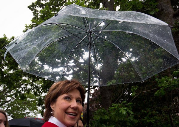 B.C. Premier and Liberal Leader Christy Clark uses an umbrella as she walks into a coffee shop for a campaign stop in Oak Bay, B.C., on Monday May 13, 2013. British Columbians go to the polls Tuesday for a provincial election.DARRYL DYCK/The Canadian Press