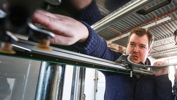 Chad Brown of Viryl Technologies with a vinyl press machine prototype in a manufacturing building in Toronto.Glenn Lowson/The Globe and Mail