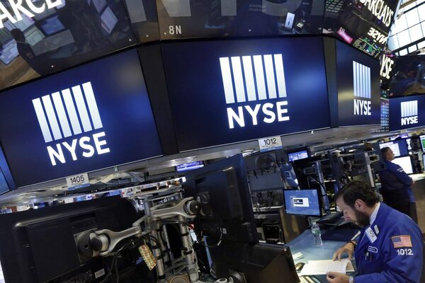 Screens above trading posts on the floor of the New York Stock Exchange show only the NYSE logo after an outside provider technical glitch, Thursday, Aug. 27, 2015.Richard Drew/The Associated Press