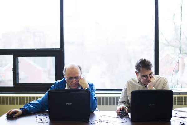Ken Munro and Chris Lamb search for jobs at the USW Job Action Centre in Toronto on April 30, 2014.Michelle Siu/The Globe and Mail