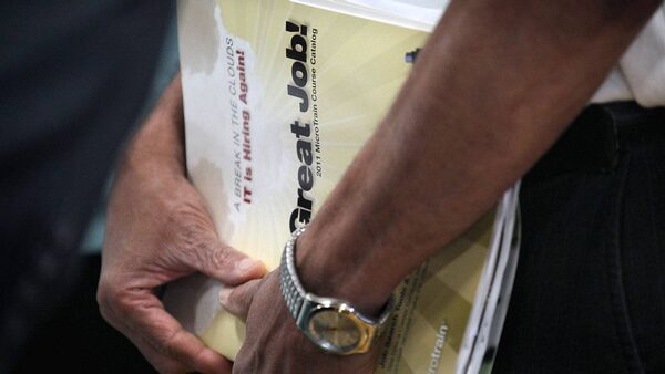 A job seeker clutches a catalogue for a job-training program collected at a job fair hosted by Illinois State Senator Dan Kotowski and the Illinois Department of Employment Security on September 15, 2011 in Park Ridge, Illinois.Scott Olson