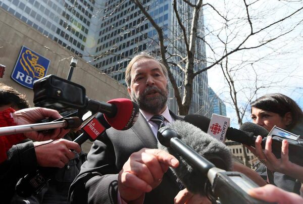NDP and Official Opposition Leader Thomas Mulcair speaks to the media Monday regarding the Conservative’s Temporary Foreign Workers program in front of the RBC offices in Montreal, April 8, 2013.Christinne Muschi/The Globe and Mail