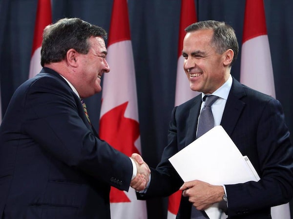 Federal Finance Minister Jim Flaherty, left, congratulates Mark Carney after it was announced that Mr. Carney will be the new head of the Bank of England.FRED CHARTRAND/The Canadian Press