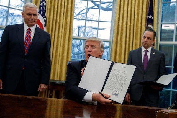 President Donald Trump shows off an executive order to withdraw the U.S. from the 12-nation Trans-Pacific Partnership trade pact agreed to under the Obama administration.Evan Vucci/The Associated Press