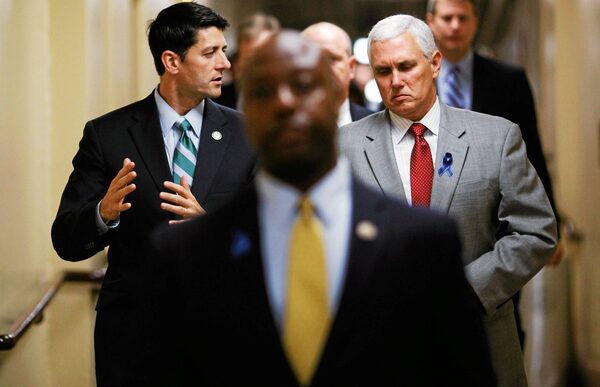 House budget committee chairman Paul Ryan, left, talks with U.S. Rep. Mike Pence prior to a Republican conference meeting on Monday. Chip Somodevilla/Getty ImagesChip Somodevilla/Getty Images