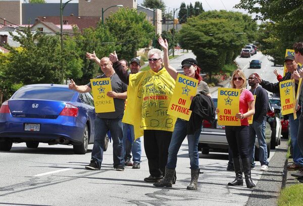 Striking B.C. Government and Service Employees' Union worker wave at passing vehicles at the liquor distribution branch on East Broadway in Vancouver July 3, 2012.Jeff Vinnick/The Globe and Mail