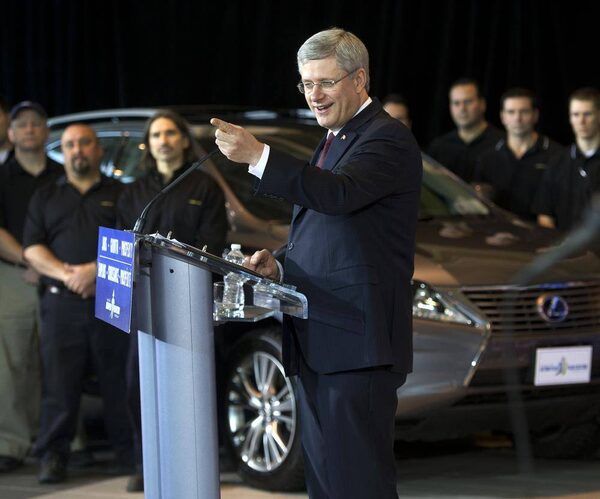 Prime Minister Stephen Harper speaks at the Toyota plant in Cambridge, Ont., on January 23 while announcing new government investment in the production of hybrid vehicles. One of the sticking points in free trade talks with the EU is the level of Canadian and EU content in Canadian-made vehicles needed to ensure duty-free access for vehicles being shipped from assembly plants in Canada.Kevin Van Paassen/The Globe and Mail