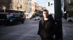 He listens. There's the constant low crackle of nearby electrical towers in the damp winter air, and behind that, the more distant thump of the metal-stamping machines in the factory, a block away, where he has been working for 17 years.