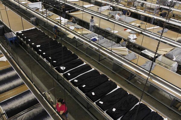 Workers cut fabric at the Karen Kane clothing company in Los Angeles, California June 30, 2011.LUCY NICHOLSON/Reuters