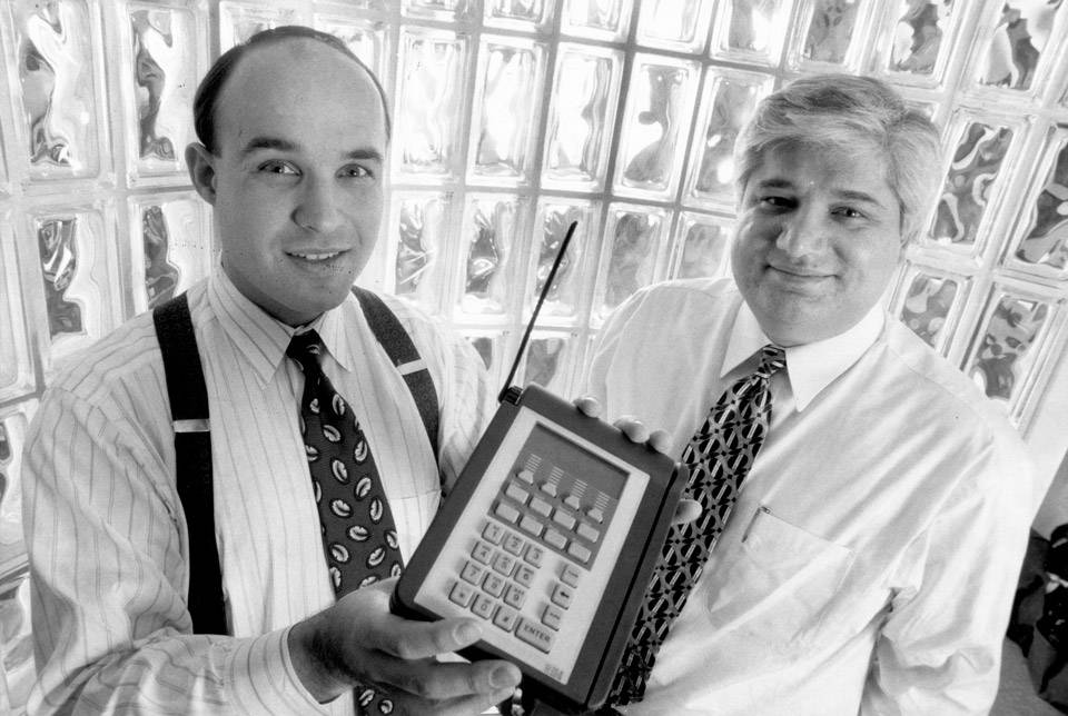 In this 1994 file photo, Jim Balsillie, left, and Mike Lazaridis show off a wireless scanner that processes credit and debit card transactions. Tibor Kolley/The Globe and Mail