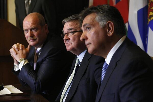 Finance Minister Jim Flaherty, centre, takes part in a news conference with Ontario Finance Minister Charles Sousa, right, and British Columbia Finance Minister Mike de Jong after signing an agreement to set up a cooperative capital markets regulator, in Ottawa Sept. 19, 2013.CHRIS WATTIE/Reuters