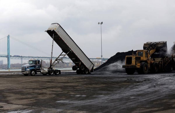 A truck unloads a large pile of petcoke in Detroit. Petcoke began appearing along the Detroit River in the spring, several months after the Marathon Oil refinery completed a $2.2-billion expansion.KATHLEEN GALLIGAN/The Associated Press