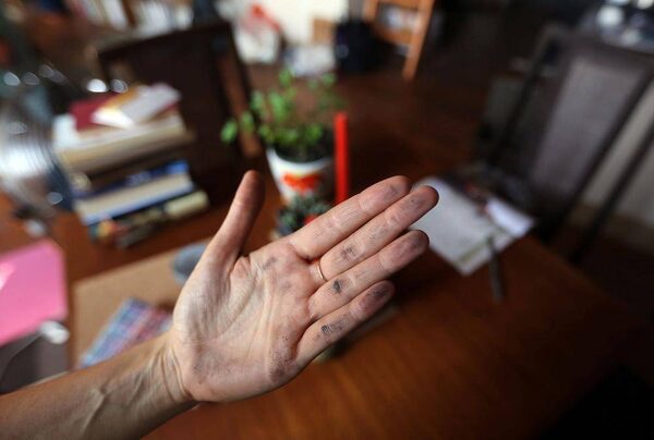 Serene Arena wipes down her countertop and shows the end result in her Lafayette apartment loft overlooking a petcoke pile in Detroit. Arena said she began noticing a strange dust on her countertops after petcoke piles rose along the banks of the Detroit River earlier this year.ANDRE J. JACKSON/The Associated Press