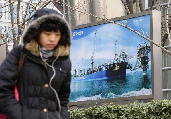 A woman walks past a poster showing an offshore work platform from the China National Offshore Oil Corp (CNOOC) next to its headquarters building in Beijing, December 10, 2012.JASON LEE/Reuters
