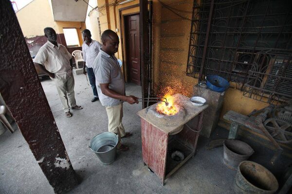 On a shaded patio off a large pink and yellow building in central Accra, Kweku Boohene, a Ghanaian goldsmith with a stubbly grey beard, is watching the glowing coals of his makeshift smelter turn to white ash.