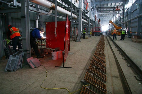 Workers complete some of the final assembly of a 275-metre long building at the Berthold oil terminal, where North Dakota crude oil will be loaded onto trains.NATHAN VANDERKLIPPE/The Globe and Mail