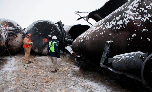 National Transporation and Safety Board (NTSB) member Robert Sumwalt, right, views damaged rail cars at the scene of the BNSF train accident in Casselton, N.D., Jan. 1, 2014.NTSB/Reuters