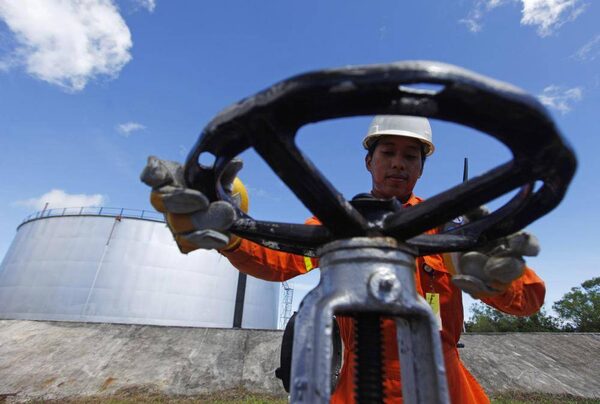 A worker opens a gauge near crude oil tanks on Bunyu island, Indonesia's East Kalimantan province in this February 8, 2011 file photograph.BEAWIHARTA/Reuters