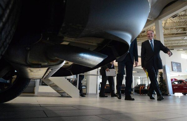 Environment Minister Peter Kent, right, arrives to take part in a news conference at a car dealership in Ottawa on Tuesday, Nov. 27, 2012.Sean Kilpatrick/The Canadian Press