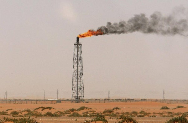 A gas flame is seen in the desert near the Khurais oilfield, about 160 km from Riyadh, owned by state oil giant Saudi Aramco.ALI JAREKJI/Reuters