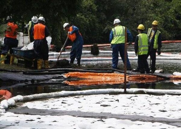 In this July 30, 2010 file photo, crews clean up oil, from a ruptured pipeline, owned by Enbridge Inc., near booms and absorbent materials where Talmadge Creek meets the Kalamazoo River as in Marshall Township, Mich.Paul Sancya/The Associated Press
