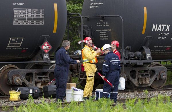 People from several juristictions – including the federal and Quebec environment ministries and the RCMP – prepare to do some investigative work in the area of nine tank cars sitting on the tracks in Nantes, Que., on July 11, 2013.PETER POWER/The Globe and Mail