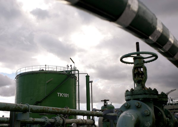 A crude oil storage tank and pipe operate at the Vermilion Energy site in Vaudoy-en-Brie, France.Antoine Antoniol/Bloomberg