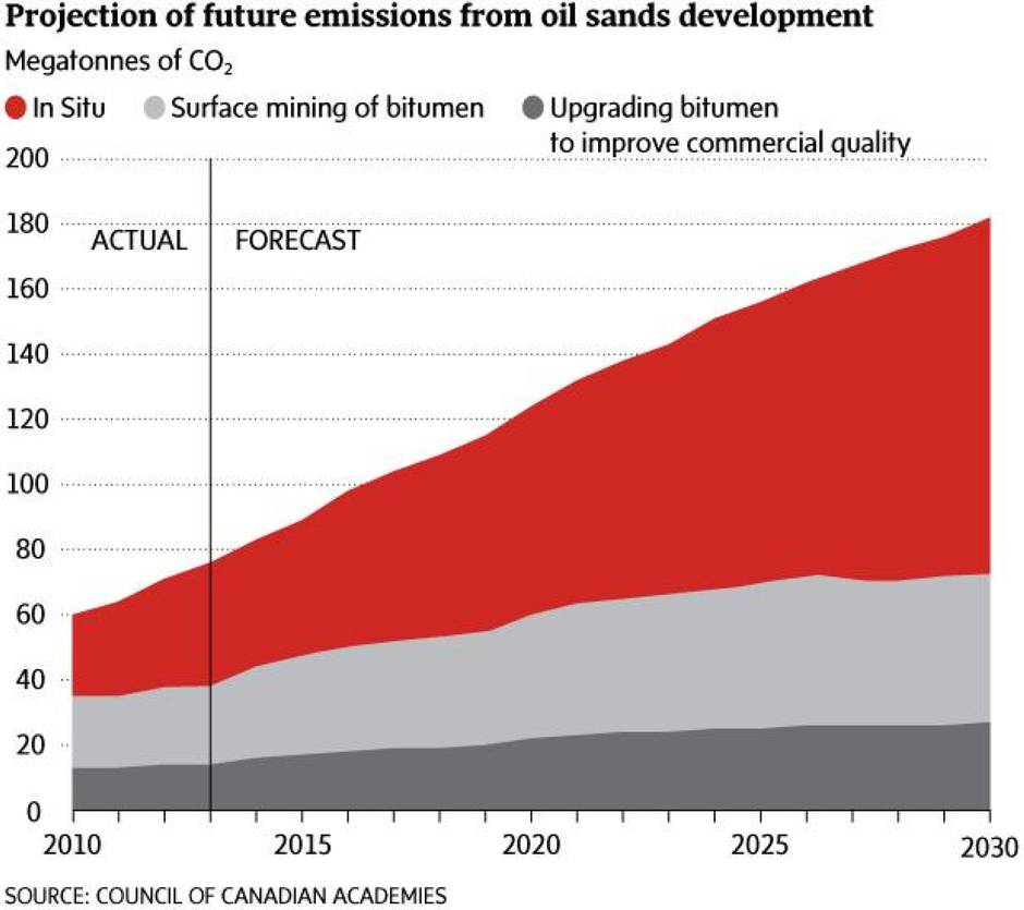 Without any change to current practices – and given current forecasts for production increases – the oil sands would generate 180 million tonnes of CO2 a year by 2030, a tripling of its 2010 level. Such an increase would make if extremely difficult for Canada to meet the commitment announced early this month by Prime Minister Stephen Harper to reduce by 2030 GHG emissions by 30 per cent from 2005 levels.