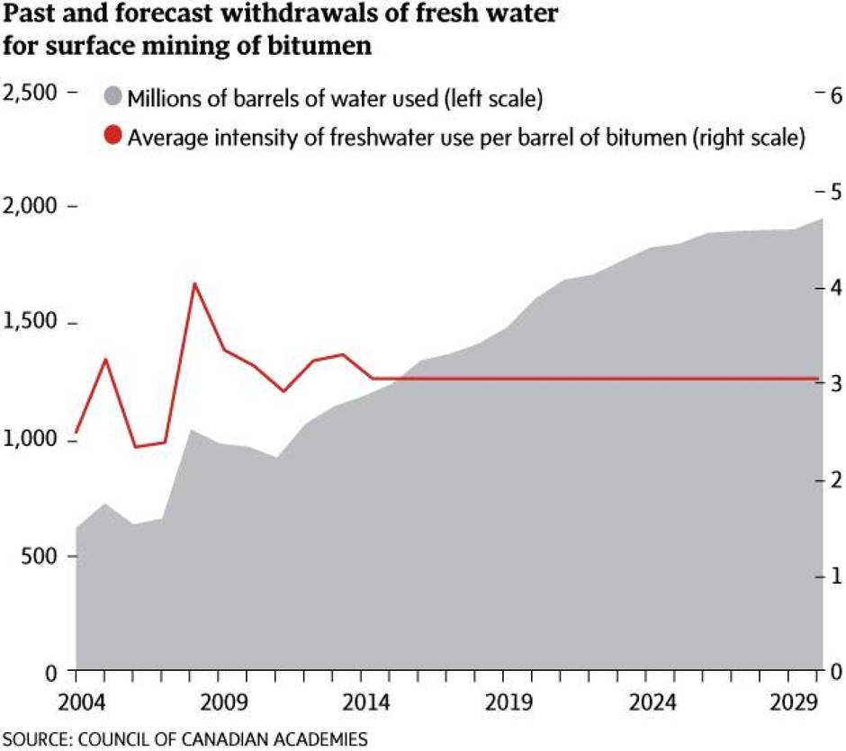 The mining side of the business uses roughly three barrels of water for every barrel of oil produced, while the in situ producers use a third of a barrel of water for every barrel of crude. Given expansion plans, the council report forecasted that water withdrawals for mining operations will double from 2012 to 2030, to 2 billion barrels of water a year. The current use is less than 1 per cent of the water available from the Athabasca.