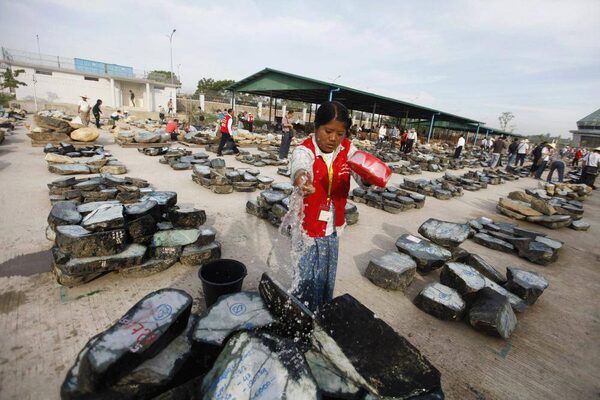 A worker waters jade stones at Myanmar's 2011 Mid-Year Emporium for jade, gems and pearls at a hall in the capital Naypyitaw. The stones sold there are a small percentage of the country’s production with the rest being smuggled.SOE ZEYA TUN/Reuters