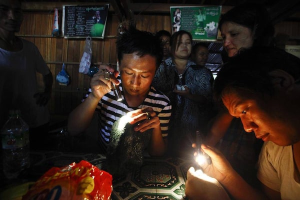 Traders inspect jade on so-called “jade tables” in a tea shop in Lone Khin village, Hpakant township. Chinese traders dominate the Myanmar jade market.MINZAYAR/Reuters