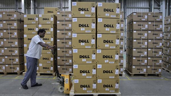 A man pushes a trolley stacked with Dell computers through a company factory in the southern Indian state of Tamil Nadu in this file photo from June, 2011.BABU