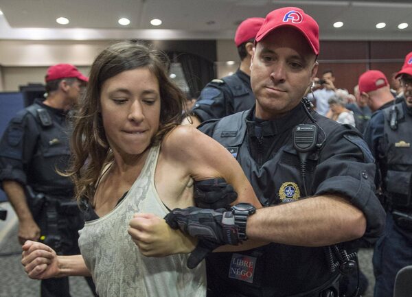 A demonstrator is taken away by a police officer after disrupting the National Energy Board public hearing into the Energy East pipeline project in Montreal on Monday.Paul Chiasson/The Canadian Press