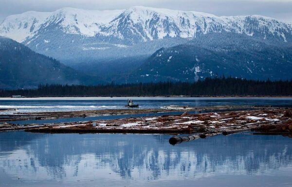 A worker uses a small boat to move logs on the Douglas Channel at dusk in Kitimat, B.C., on Wednesday January 11, 2012. Douglas Channel is the proposed termination point for an for an oil pipeline from Alberta as part of the Enbridge Northern Gateway Project.DARRYL DYCK/The Canadian Press